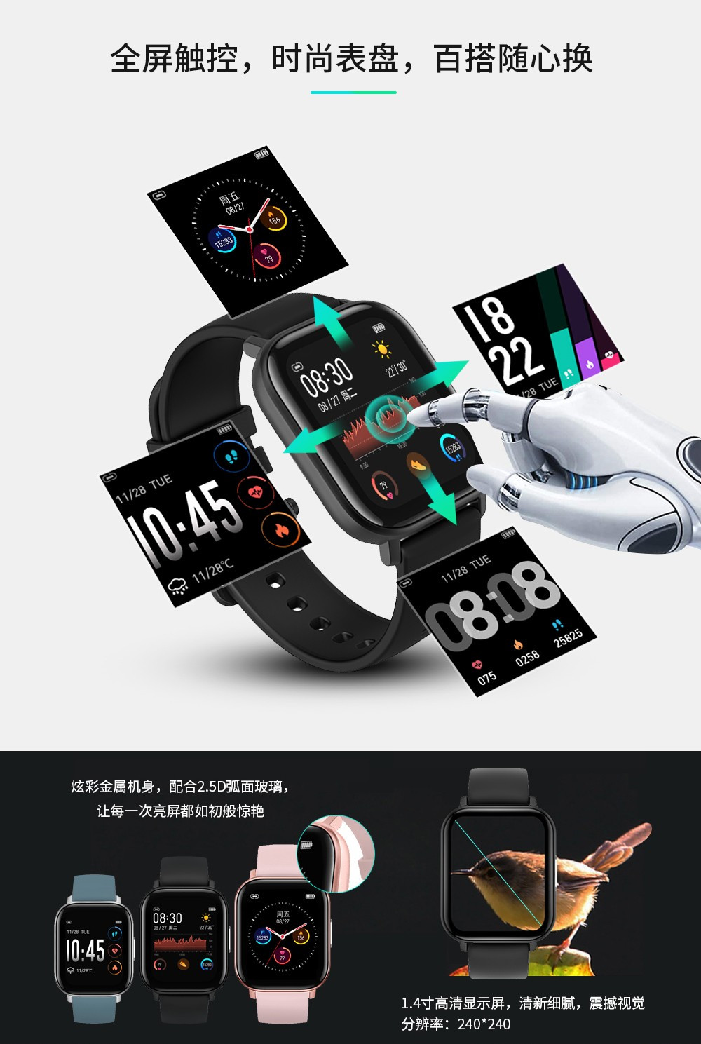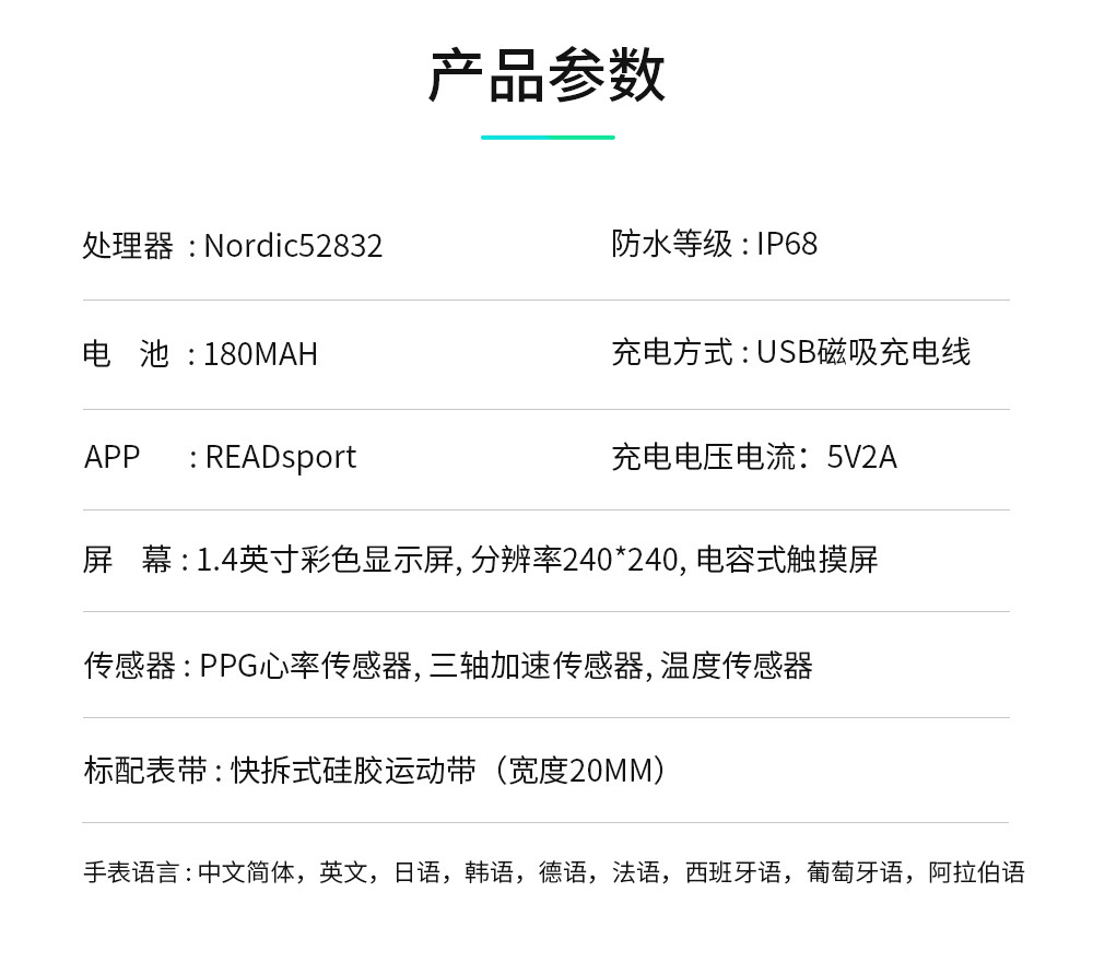 產(chǎn)品類型:智能穿戴? ? ? ? ? ? ? ? ? ? ? ? ? |? ?信息推送:支持 屏幕尺寸:1.4inch? ? ? ? ? ? ? ? ? ? ? ? ? ? |? ?來(lái)電提醒:支持 分辨率:240*240? ? ? ? ? ? ? ? ? ? ? ? ? ? ?|? ?防水:IP68 操作平臺(tái):NRF52832? ? ? ? ? ? ? ? ? ? ? ?|? ?震動(dòng)模式:支持 材質(zhì):鋅合金? ? ? ? ? ? ? ? ? ? ? ? ? ? ? ? ? ? |? ?側(cè)鍵:支持 內(nèi)存:64KB+512KB? ? ? ? ? ? ? ? ? ? ? ? ?|? ?充電器:磁鐵彈簧針 存儲(chǔ):64M bit? ? ? ? ? ? ? ? ? ? ? ? ? ? ? ? ? |? ?GPS:不支持 功能介紹? ? ? ? ? ? ? ? ? ? ? ? ? ? ? ? ? ? ? ? ? ?|? ? APP:支持專門APP 藍(lán)牙:藍(lán)牙 4.0, 支持安卓和iOS系統(tǒng)? ?|? ?語(yǔ)言:多語(yǔ)言 多運(yùn)動(dòng)模式:支持? ? ? ? ? ? ? ? ? ? ? ? ? ? ? |? ?手表語(yǔ)言:APP語(yǔ)言 心率測(cè)試:3300光學(xué)心率傳感器? ? ? ? |? ? 說(shuō)明書語(yǔ)言:手表語(yǔ)言 體溫測(cè)試:支持? ? ? ? ? ? ? ? ? ? ? ? ? ? ? ? ?|? ? 結(jié)構(gòu)特點(diǎn) 呼吸功能:支持? ? ? ? ? ? ? ? ? ? ? ? ? ? ? ? ?|? ? 尺寸:43.25*36.25*9.5mm 節(jié)拍器:支持? ? ? ? ? ? ? ? ? ? ? ? ? ? ? ? ? ? |? ? 電池:180MA 計(jì)步器:支持? ? ? ? ? ? ? ? ? ? ? ? ? ? ? ? ? ? |? ? 顏色:玫瑰金,黑色,銀色 睡眠監(jiān)測(cè):支持? ? ? ? ? ? ? ? ? ? ? ? ? ? ? ? ?|? ?包裝尺寸:102*83*68MM G-傳感器:支持